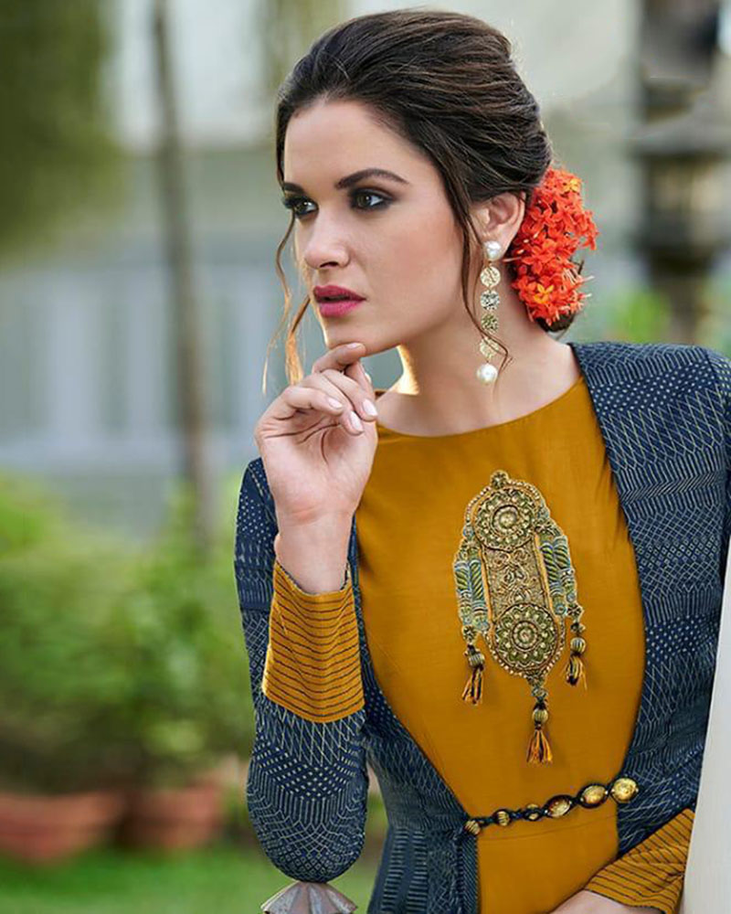 We have ensemble a symphony of enchanting piece to restyle your senses. Make an adorable statement in such a smashy A Line Tusser Silk Mustard Gown. (Slight variety in shading, texture and work is conceivable. Model images are only representative.)