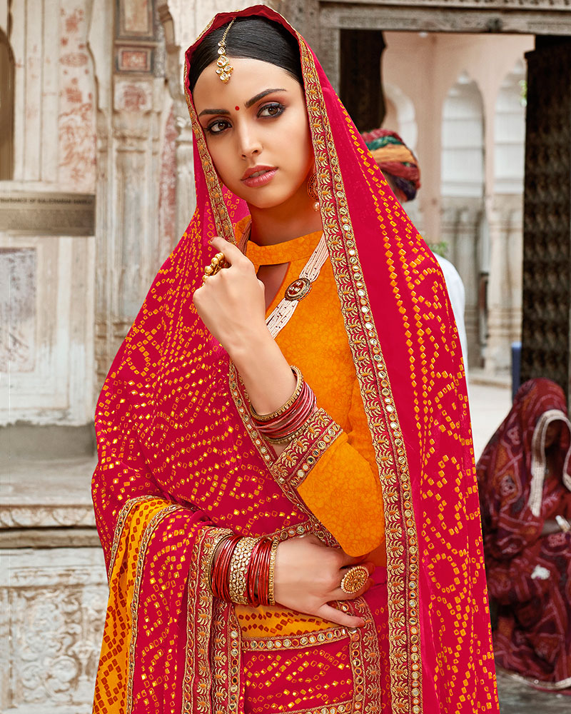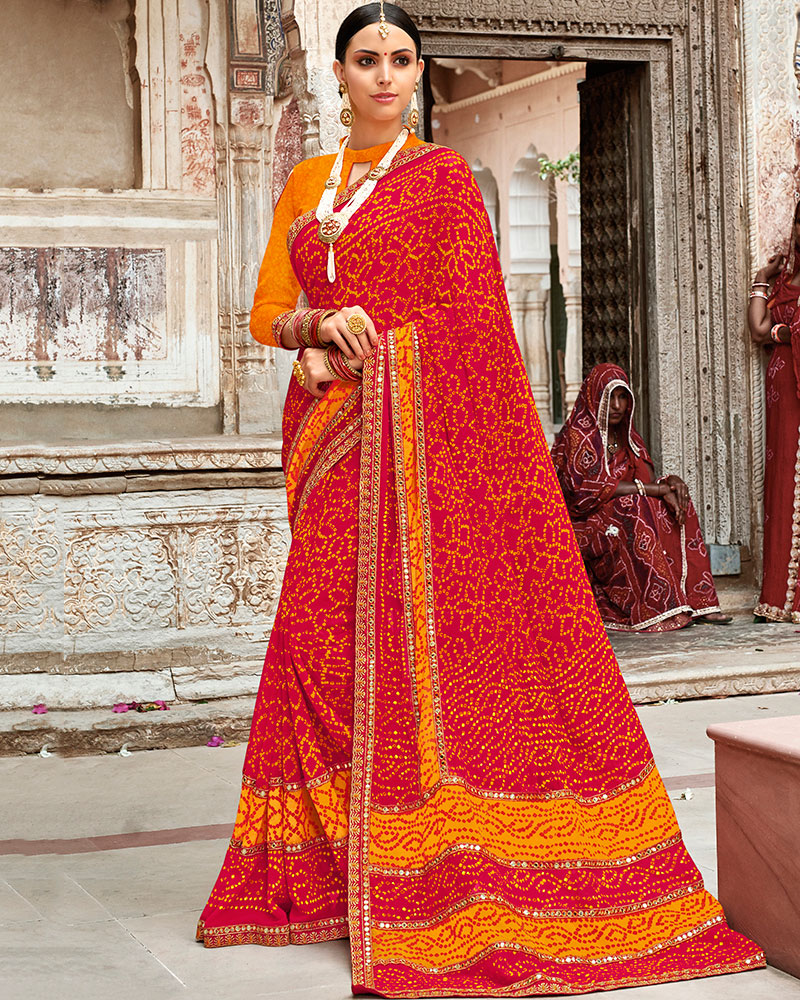 Bandhani With Heavy Border Georgette Red And Yellow Bandhej Saree