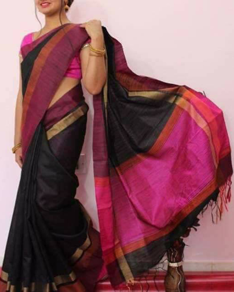 You Will Be The Center Of Attention In ThisAttire. Add Grace And Charm To Your Appearance In This Black Khadi Cotton Silk Saree With Contrast Pallu With Royal Tassels And Contrast Blouse. Comes With Matching Blouse. (Slight variety in shading And texture and work is conceivable. Model images are only representative.)