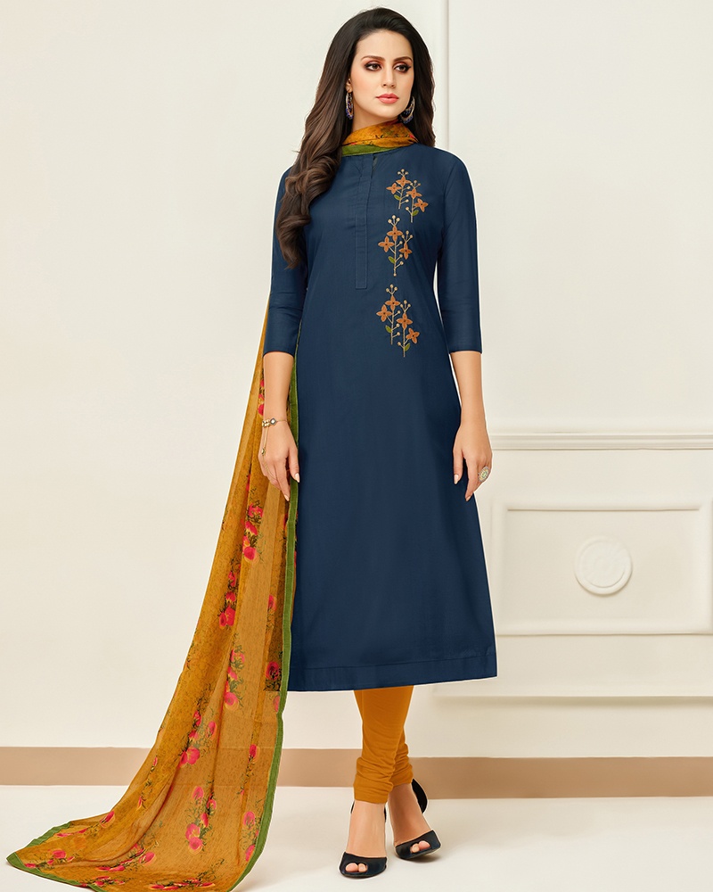 This season your look gets better definition with just a little attention to detail. Keep ahead in fashion with this Tantalizing Navy Chanderi Cotton Casual Or Partywear Salwar Kameez Dress Material. The Fabric Of Salwar Suit Top Chanderi Cotton Bottom Cotton And Dupatta Chiffon. Comes With Matching Bottom And Dupatta. (Slight variety in shading, Fabric and work is conceivable. Model images are only representative.)