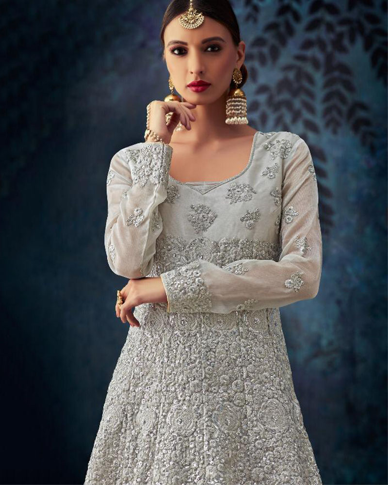 Gray Anarkali Style Organza Silk Salwar Kameez