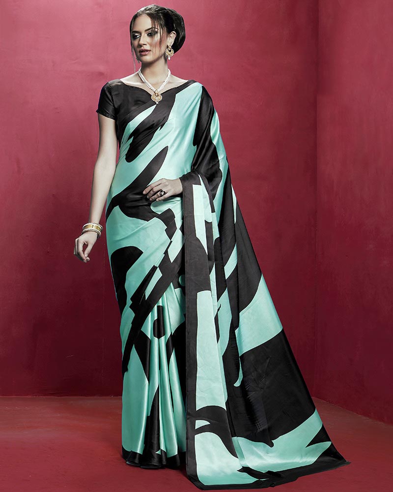 This eye catching elegant drape is perfect for any occasion. Outstanding craftmanship of embellishments exhibited in this Charismatic Green, Black Japan Satin Crepe Printed Saree. Comes With Matching Blouse. (Slight variety in shading, texture and work is conceivable. Model images are only representative.)