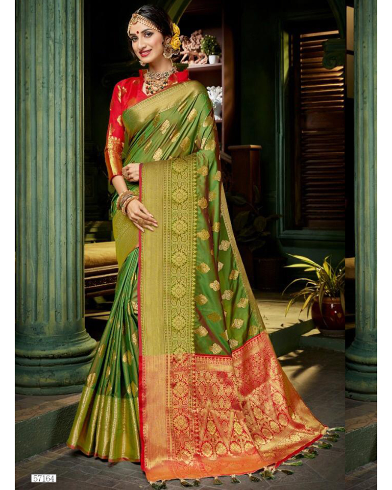 Design And Style And Pattern Would Be At The Peak Of Your Splendor When You Attire This Green Banarasi Paithani Silk Saree With Rich Zari Contrast Pallu WITHOUT TASSELS With Zari Wooven Border With Contrast Blouse. Comes With Matching Blouse. (Slight variety in shading And texture and work is conceivable. Model images are only representative.)