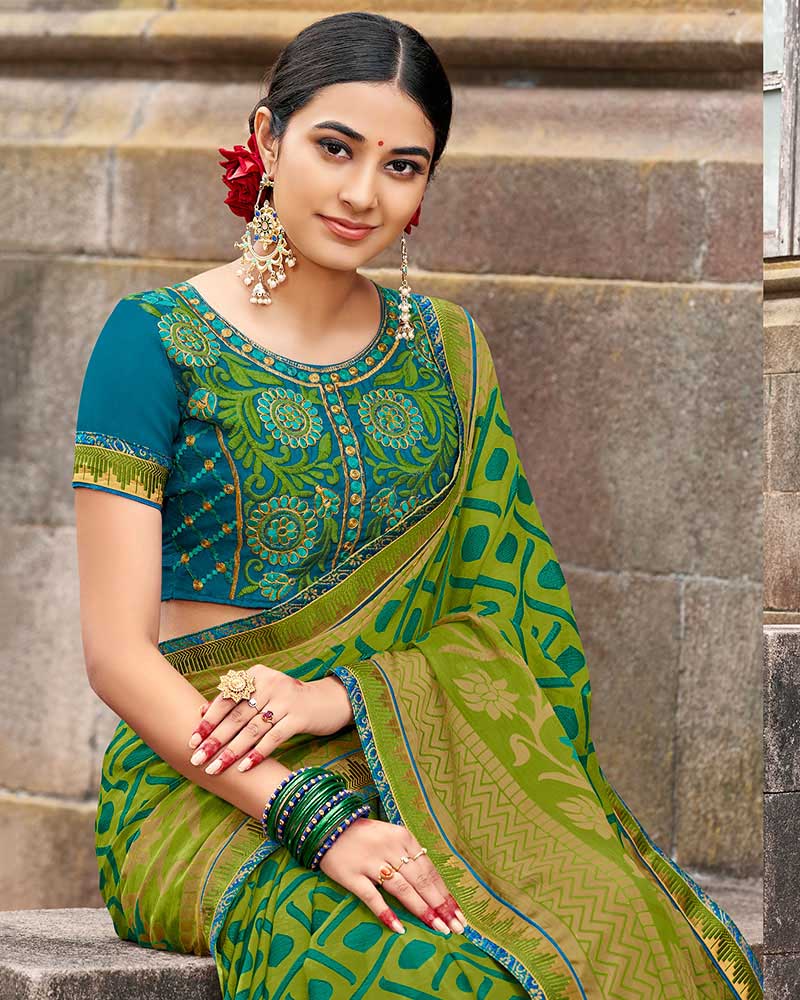 Include Yourself With The Glamour Of A Season With This Lovely Green Brasso Saree With Designer Raw Silk Blouse. Comes With Matching Blouse. (Slight variety in shading, texture and work is conceivable. Model images are only representative.)
