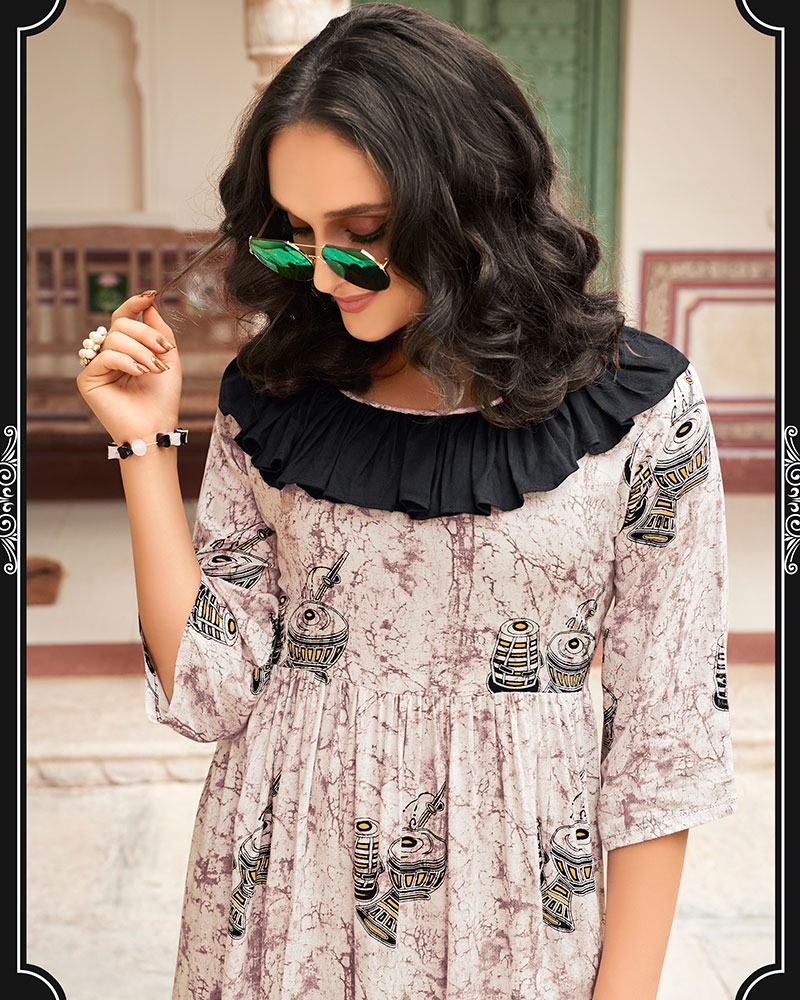 Get Going With This Majestic And Wonderful Piece And Make Your Dream Attire Look Richer To Your Persona. Look Sensationally Awesome In This Attractive Beige Heavy Rayon Party Kurti With Printed Work. (Slight variety in shading, texture and work is conceivable. Model images are only representative.)