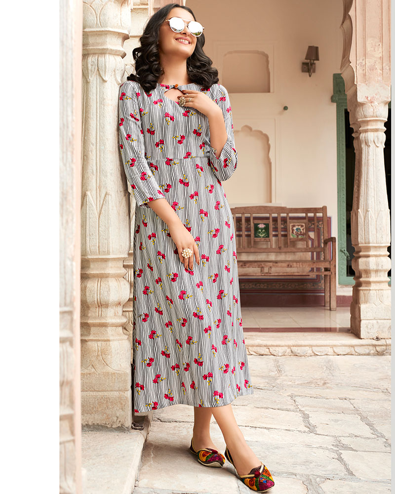 Make The Heads Flip The Moment You Costume Up With This Delightsome White Heavy Rayon Party Kurti With Printed Work. (Slight variety in shading, texture and work is conceivable. Model images are only representative.)