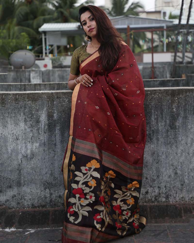 Be the sunshine of every person?s eyes dressed in this Artistic Linen Sarees Maroon Saree. Comes With Matching Blouse. (Slight variety in shading, Fabric and work is conceivable. Model images are only representative.)