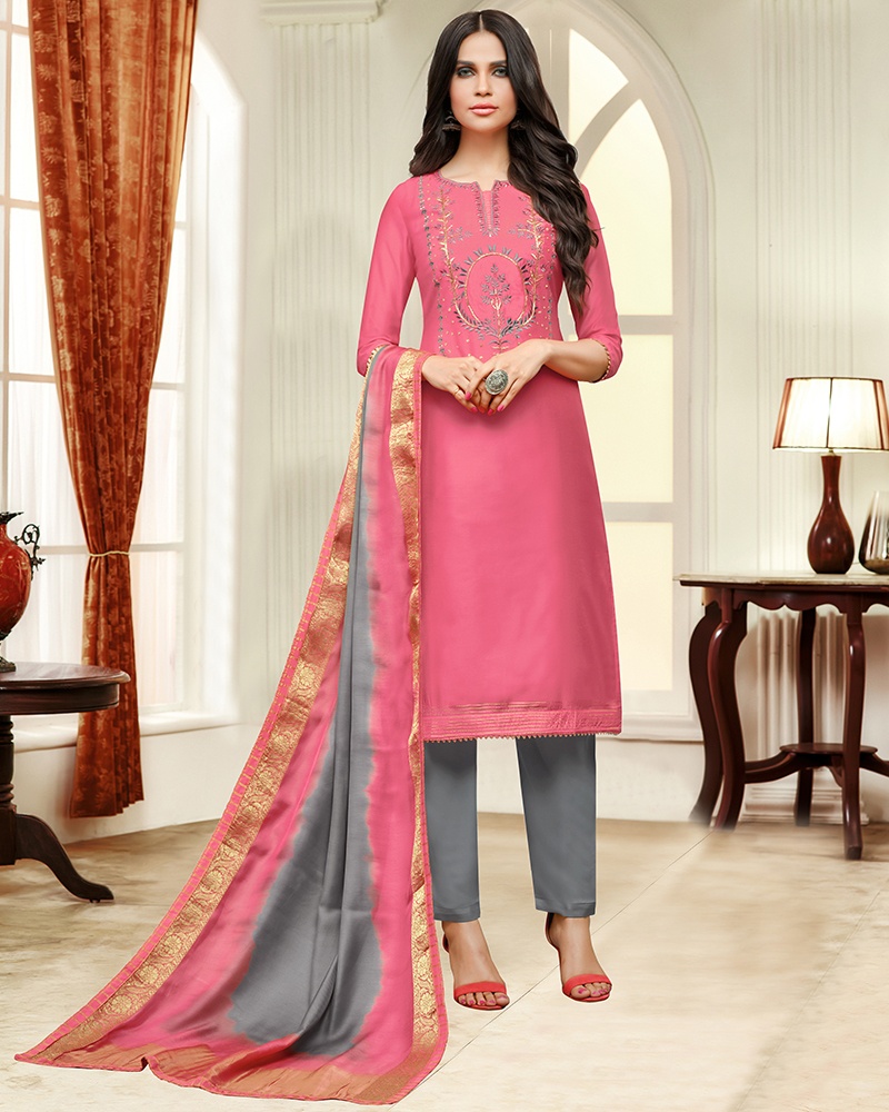 Grab the second look in this elegant attire for this season. Add grace and charm to your appearance in this Superlative Pink Masline Silk Casual Or Partywear Salwar Kameez Dress Material. The Fabric Of Salwar Suit Top Masline Silk Bottom Shantoon And Dupatta Masline and Nazneen . Comes With Matching Bottom And Dupatta. (Slight variety in shading, Fabric and work is conceivable. Model images are only representative.)