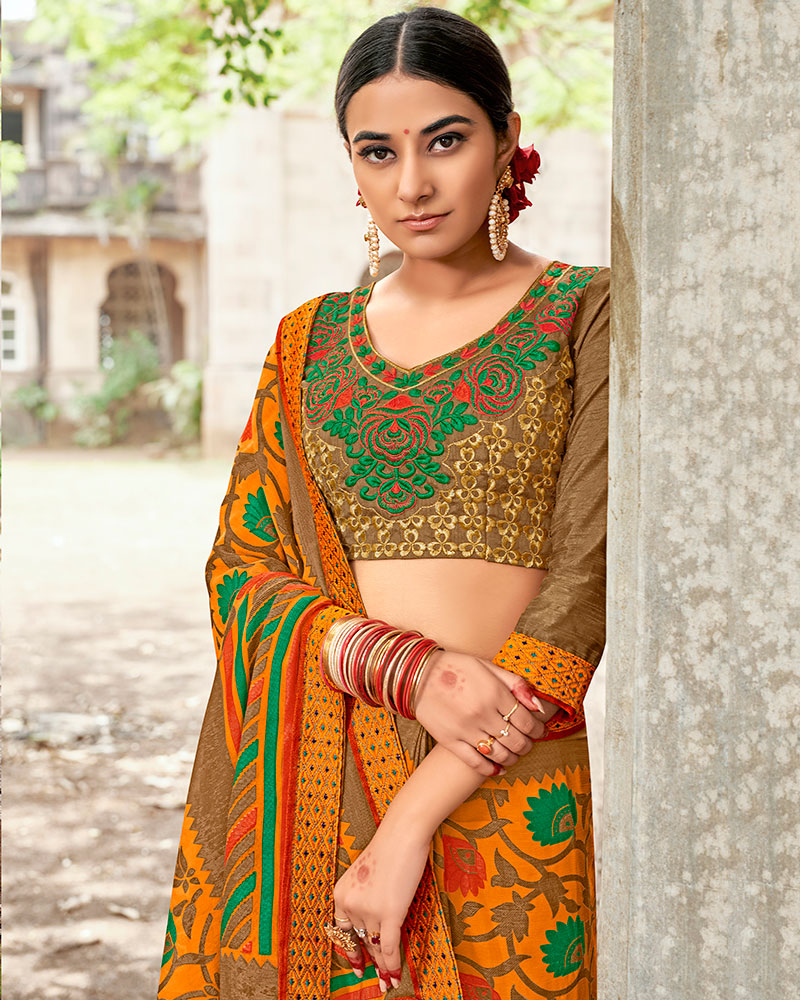 ThisBrilliant Array Will Make You The Ultimate Classic Beauty At The Next Event You Attend. Create A Smoldering Impact By This Topnotch Multicolor Brasso Saree With Designer Raw Silk Blouse. Comes With Matching Blouse. (Slight variety in shading, texture and work is conceivable. Model images are only representative.)