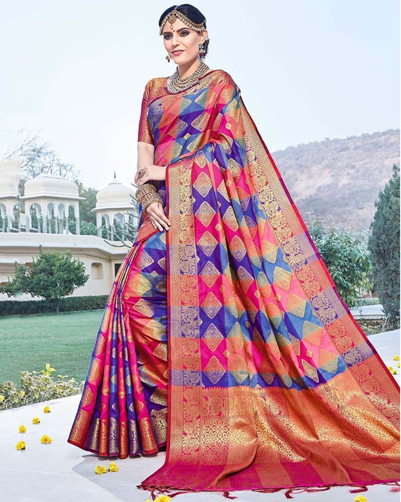 Multicolor Kanchipuram Handloom Weaving Silk Saree With Rich Contrast Zari Wooven Pallu And Rich Zari Wooven Border With Figure Desgin And Contrast Brocade Blouse. (Slight variety in shading, Fabric and work is conceivable. Model images are only representative.)