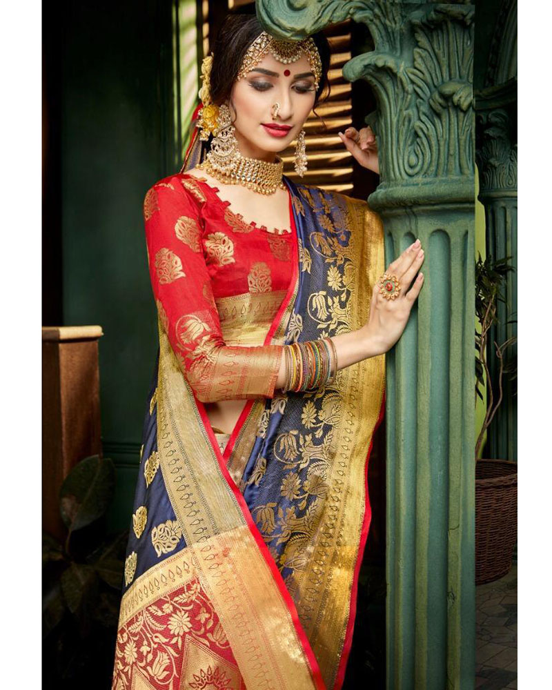 We Have Ensemble A Symphony Of Enchanting Piece To Restyle Your Senses. Make The Heads Flip As Soon As You Costume Up With This Navy Banarasi Paithani Silk Saree With Rich Zari Contrast Pallu WITHOUT TASSELS With Zari Wooven Border With Contrast Blouse. Comes With Matching Blouse. (Slight variety in shading And texture and work is conceivable. Model images are only representative.)
