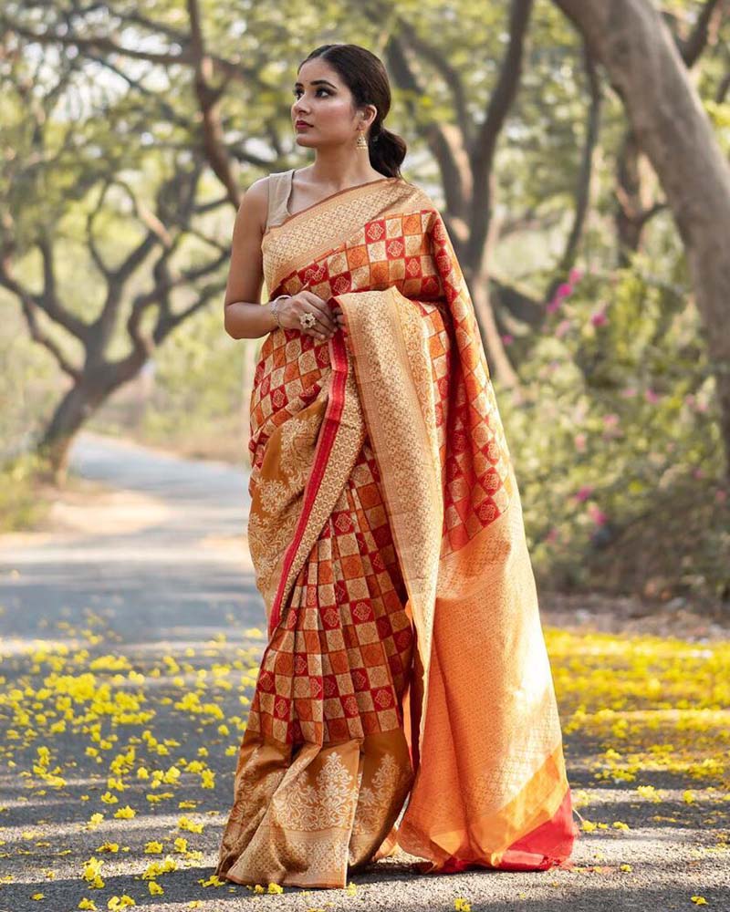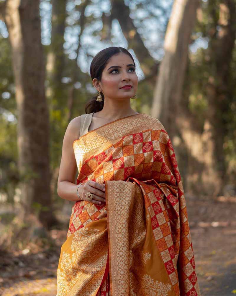 Be an angel and create and establish a smashing impact on for every person by carrying this Staggering Banarasi Silk Sarees, Handloom Silk Sarees, Weaving Silk Sarees Orange Saree. Comes With Matching Blouse. (Slight variety in shading, Fabric and work is conceivable. Model images are only representative.)