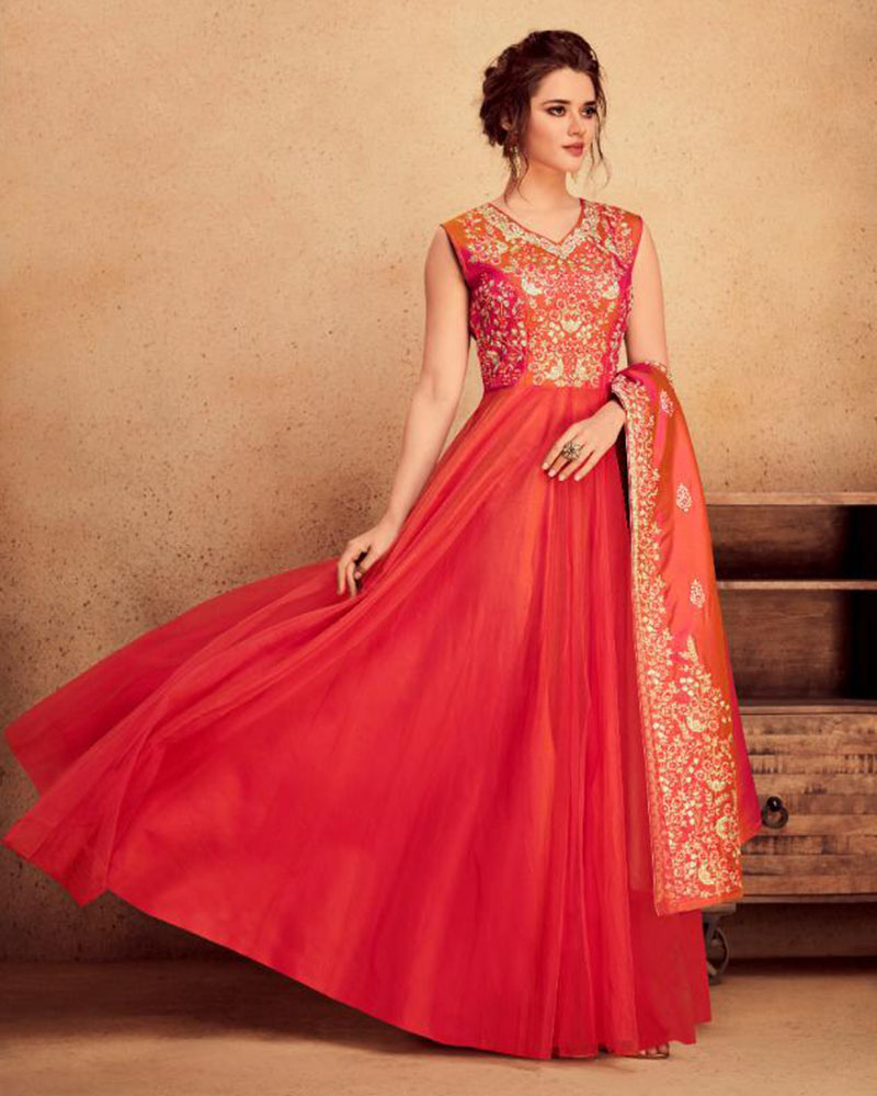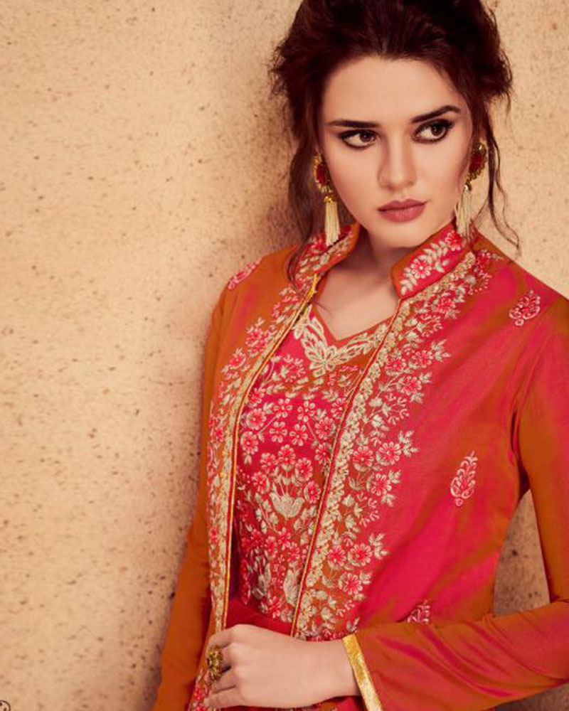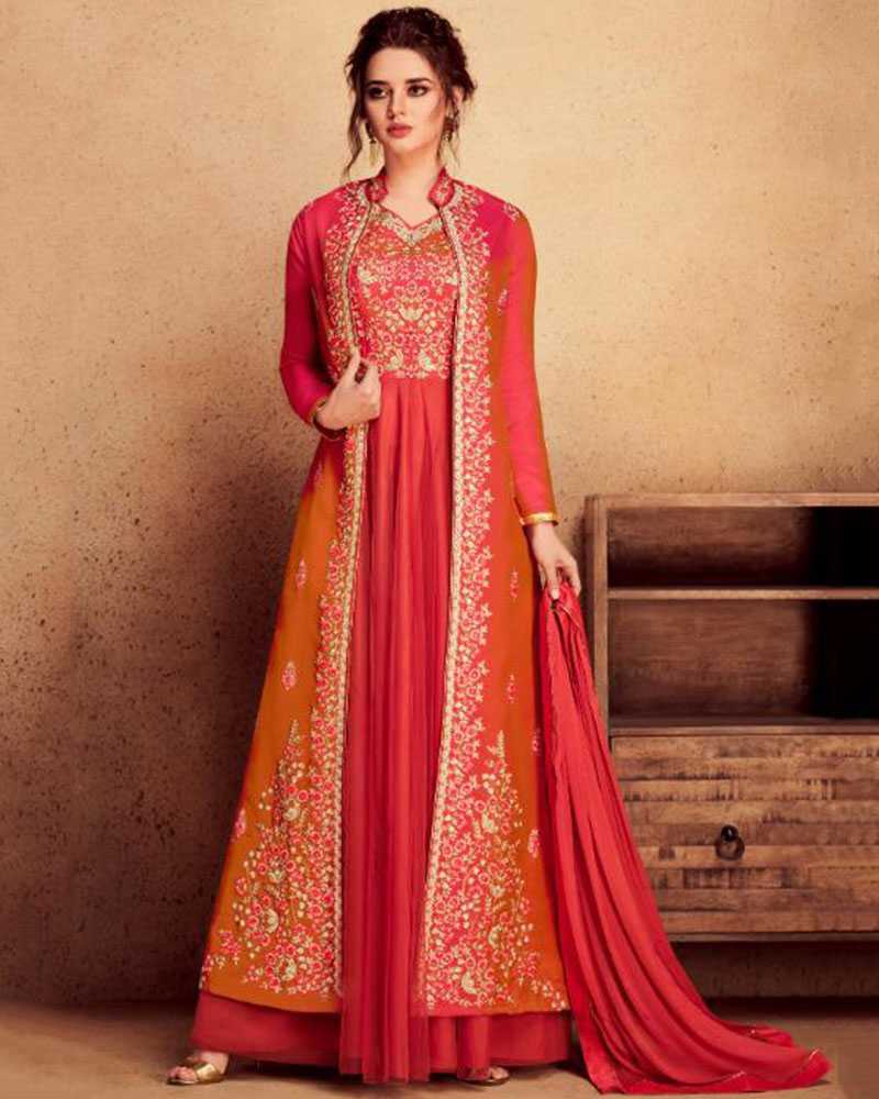 Get going with this majestic and wonderful piece and make your dream attire look richer to your persona. Add the sense of feminine beauty by this Mesmerizing Anarkali Style Silk Peach Embroidered Salwar Kameez With Embroidered Work.. Comes With Matching Bottom And Dupatta. (Slight variety in shading, Fabric and work is conceivable. Model images are only representative.)