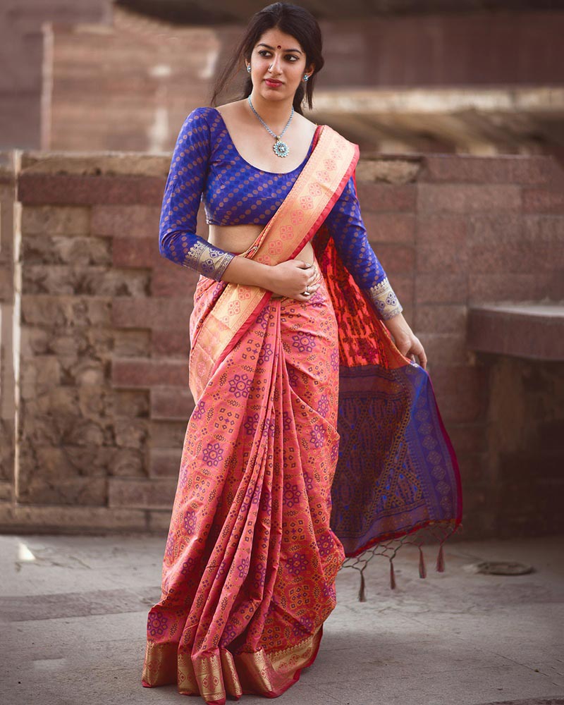 This pretty piece is a fairy tale that begins to unfold as you reveal your beauty in it. Get the simplicity and grace with this Spellbinding Peach Patola Silk Trendy Saree. Comes With Matching Blouse. (Slight variety in shading, texture and work is conceivable. Model images are only representative.)