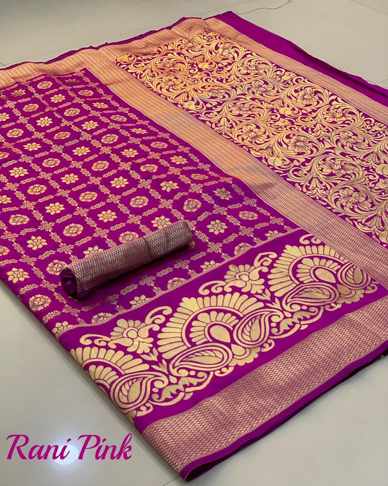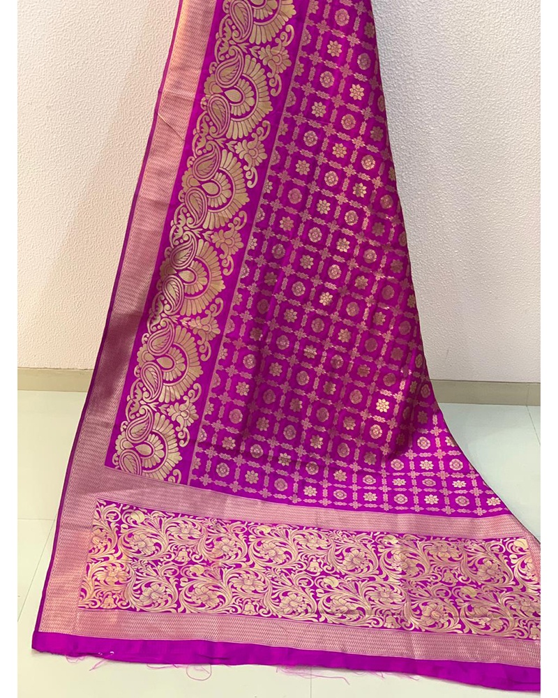 ThisEye Catching Elegant Drape Is Perfect For Any Occasion. Outstanding Craftmanship Of Embellishments Exhibited In This Rani Pink Banarasi Handloom Weaving Silk Saree With Rich Zari Pallu And Rich Heavy Border With Plain Running With Wooven Selvees Blouse And All Over Zari Weaves. Comes With Matching Blouse. (Slight variety in shading And texture and work is conceivable. Model images are only representative.)