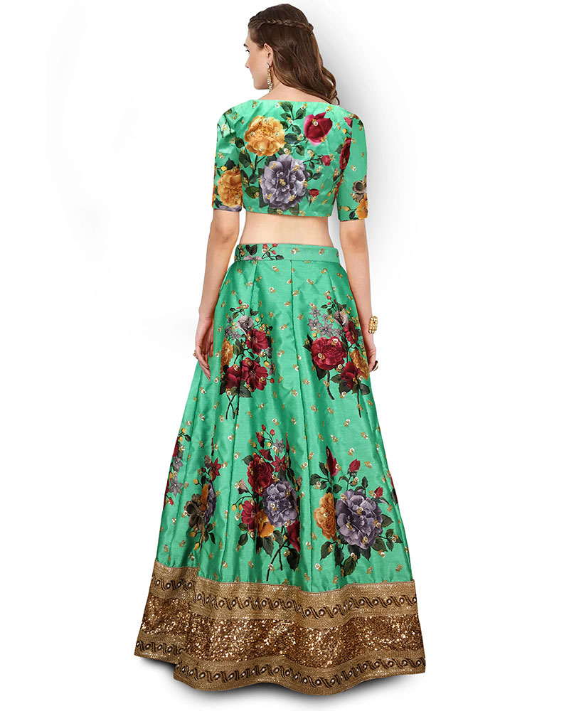 Be An Angel And Create And Ascertain A Smashing Impact On Everybody By Wearing This Stupendous Green Partywear With Digital Print, Embroidered Lehenga Choli. Comes With Matching Choli And Dupatta. (Slight variety in shading, texture and work is conceivable. Model images are only representative.)