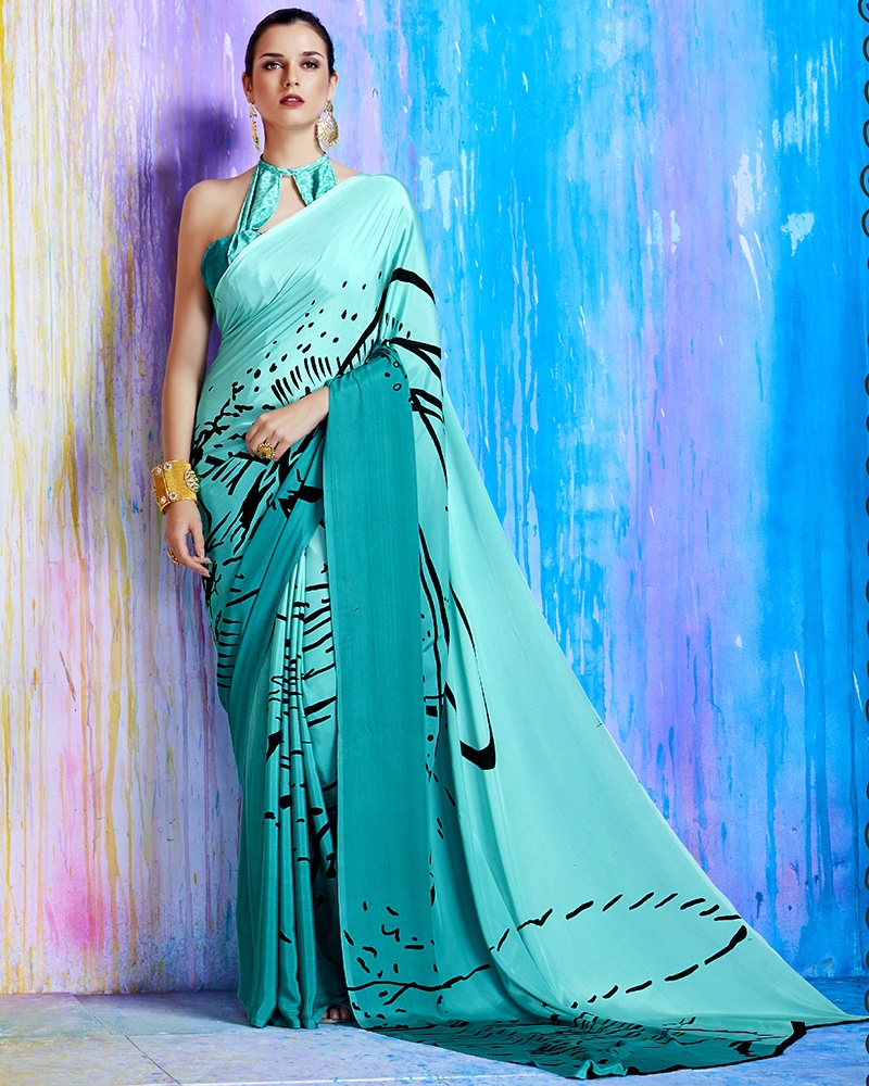 Be an angel and create and establish a smashing impact on for every person by carrying this Staggering Turquoise Crepe Silk Printed Saree With Printed Work. Comes With Matching Blouse. (Slight variety in shading, Fabric and work is conceivable. Model images are only representative.)